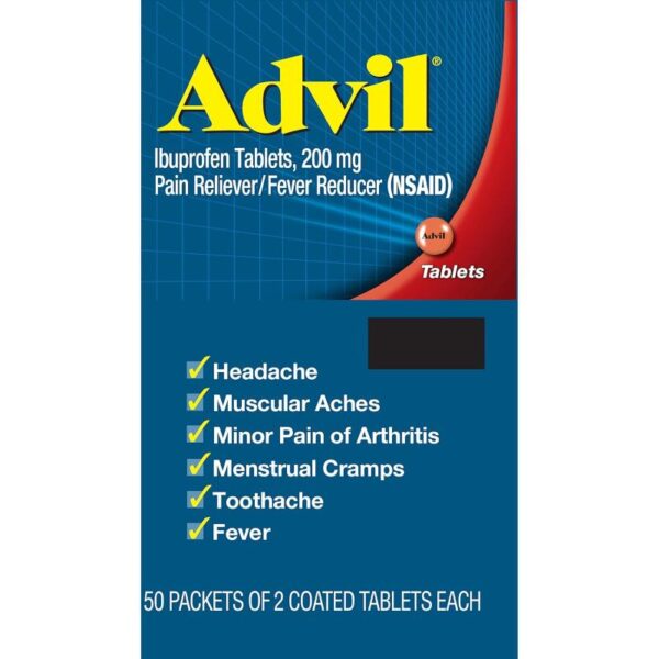 Dos paquetes de 50 tabletas recubiertas Advil para aliviar el dolor y reducir la fiebre, con ibuprofeno de 200 mg para aliviar el dolor