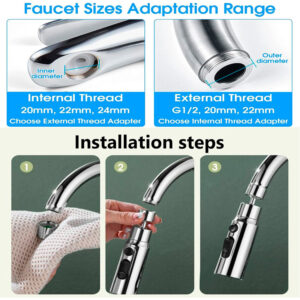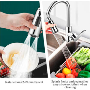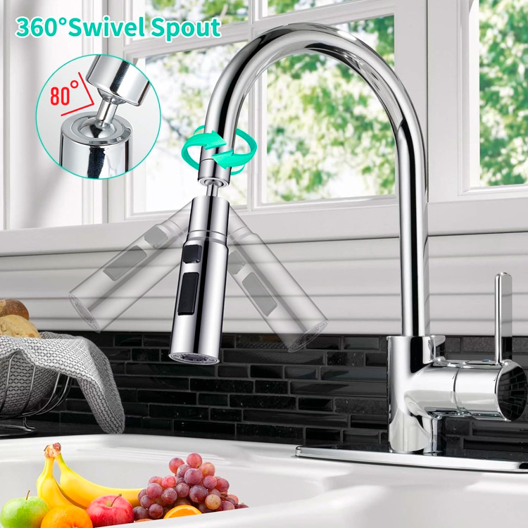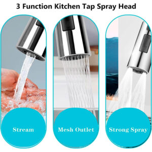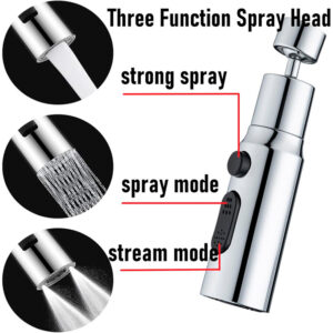 El grifo de refuerzo se puede ajustar a 3 modos de flujo de salida de agua diferentes: chorro, pulverización fuerte y pulverización. Simplemente presiona el botón del interruptor, el cabezal rociador de cocina de repuesto puede cambiar al modo que desees.