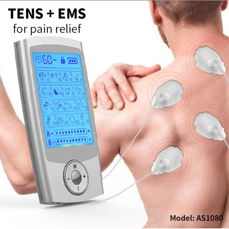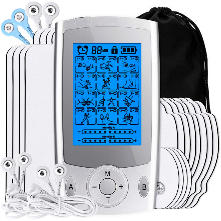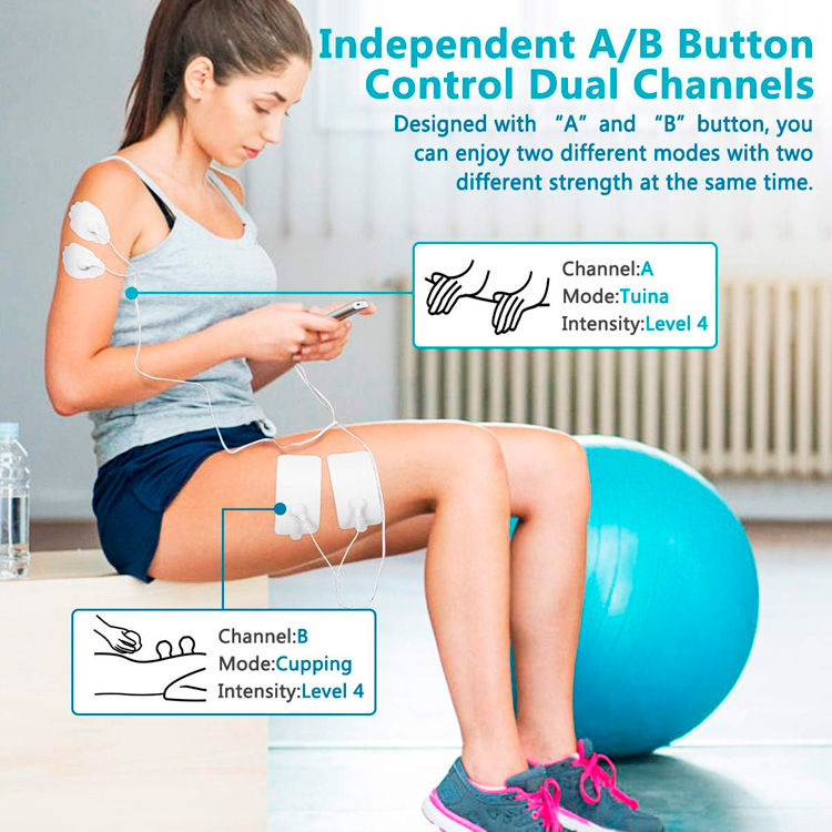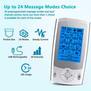 Diseño de doble canal y salida dual: diseñado con canales «A» y «B», 24 modos y 20 niveles de fuerza, puedes disfrutar de 2 modos diferentes y fuerza con 2 cables de electrodo. Por ejemplo, puede elegir el modo de acupuntura en el canal A con un nivel de intensidad de 5 para su hombro. Mientras está en el canal B, el modo Tapping se ejecuta con la intensidad establecida en el nivel 8 en la parte baja de la espalda como un estimulador eléctrico de la espalda.