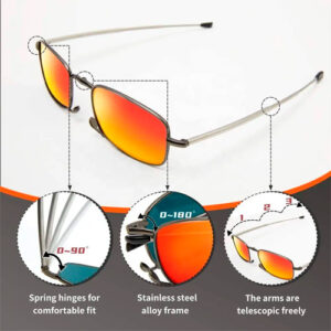 Cómodo de usar y excelente diseño – Estas gafas de sol plegables con diseño compacto, diseño de almohadilla nasal integrada, reducen la carga sobre el puente nasal, adecuadas para la mayoría de narices y personas. El diseño de patillas retráctiles de tres secciones le brinda una experiencia de uso cómoda y un alivio efectivo de la fatiga ocular y auditiva.