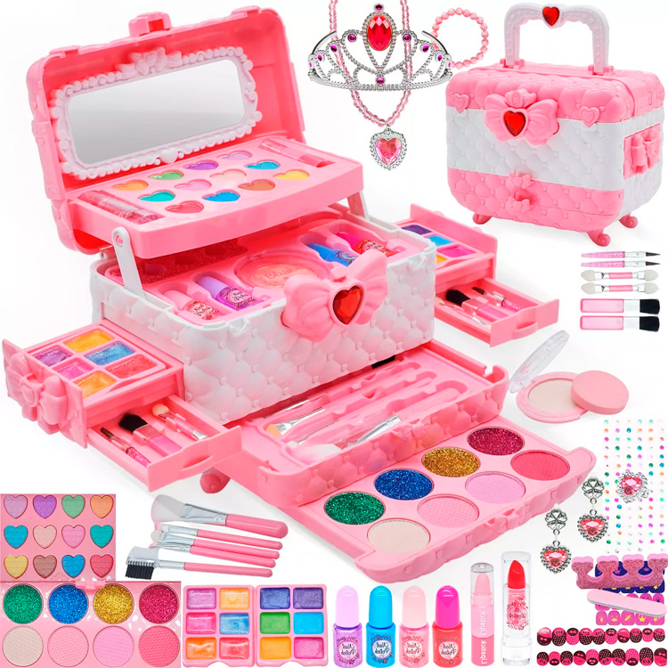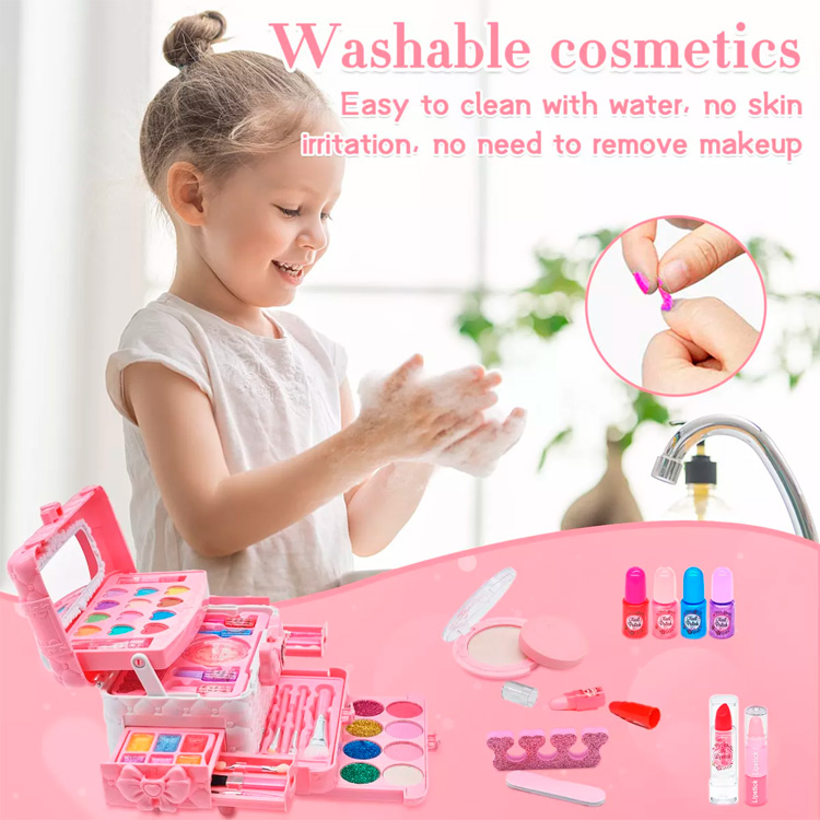 El juguete de maquillaje para niños incluye 25 piezas: lápices labiales 2, mini rímel 1, lápiz de cejas 1, mini arte de uñas 2, polvo prensado 1, sombra de ojos 3, mini brillo de labios 2, esponja 1, peine plegable 1, calcomanías de uñas 2, separador de dedos 1, lima de uñas 1, brochas de maquillaje, 5, botella vacía 1, estuche de maquillaje para niños 1. Set de maquillaje para niñas pequeñas para satisfacer la curiosidad y las necesidades de maquillaje de los niños.